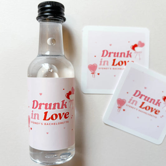 Drunk in Love Bachelorette Party Mini Liquor Label - Pink and Red Hearts