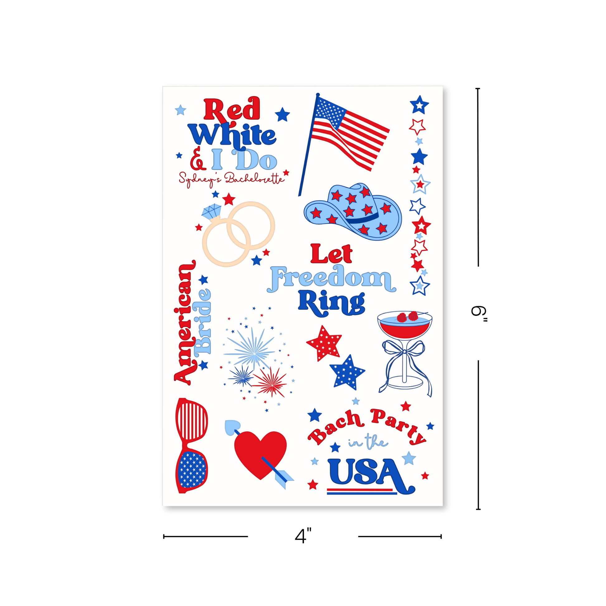 Turn up the red, white and I do with our Bach Party in the USA temporary tattoo sheets, perfect for your patriotic-themed bachelorette celebrations! Add a touch of all-American flair with these festive flash tattoos that serve as the perfect accessory for your festivities.