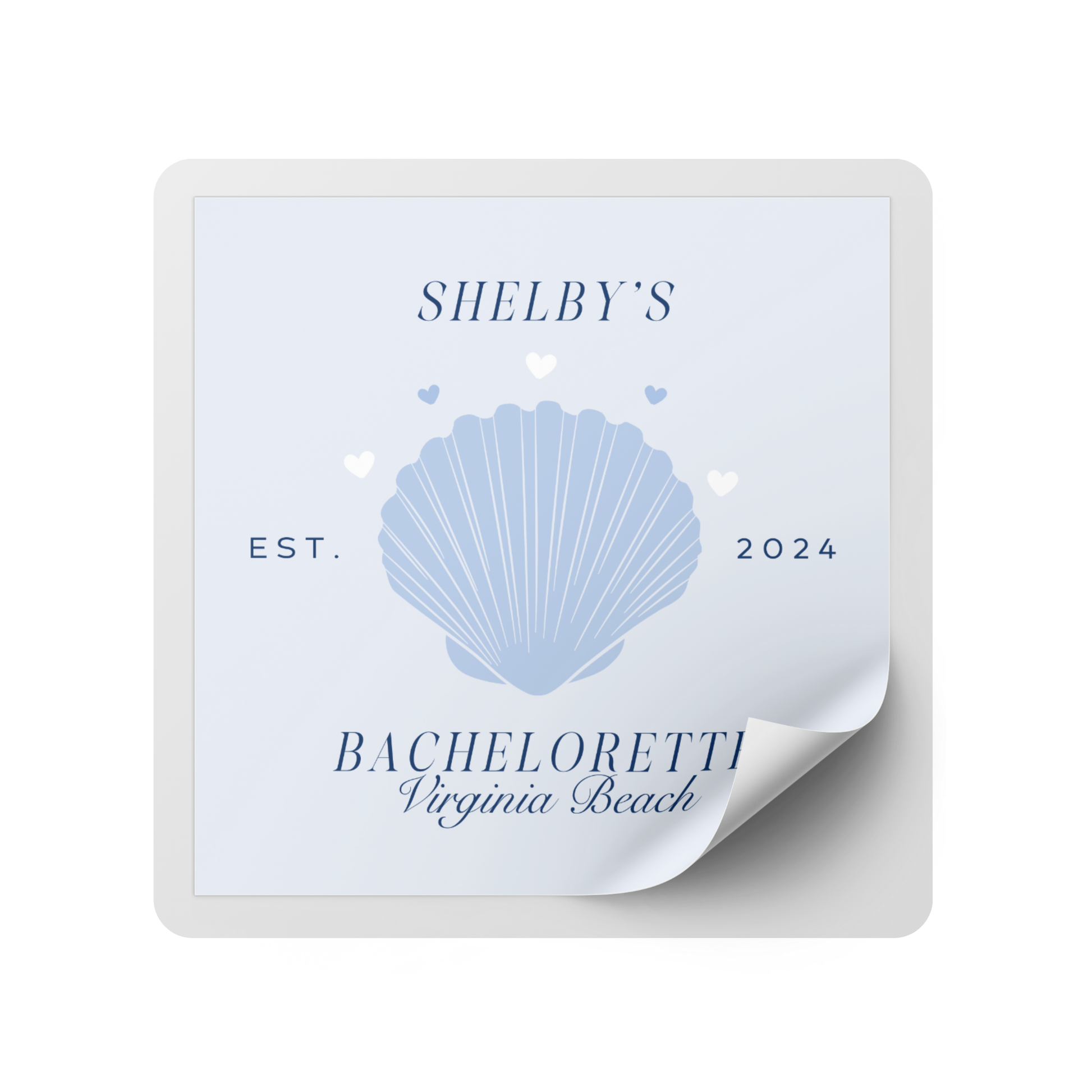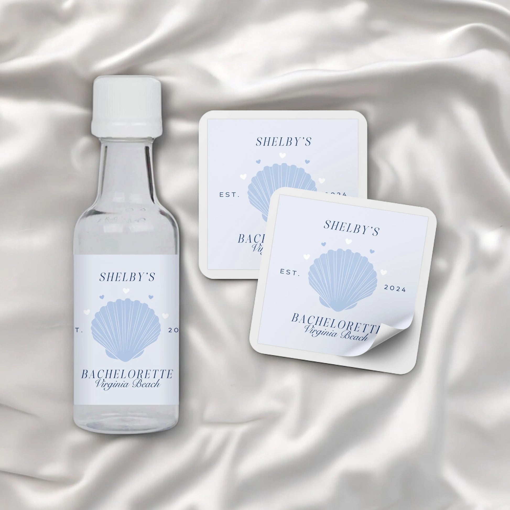 Get ready for some serious beach vibes with this custom coastal seashell bachelorette shooter label. This light blue, personalized mini liquor label is a must-have for your beach bachelorette celebrations and serves as an adorable inclusion for bachelorette gift bags, adding a personalized touch.