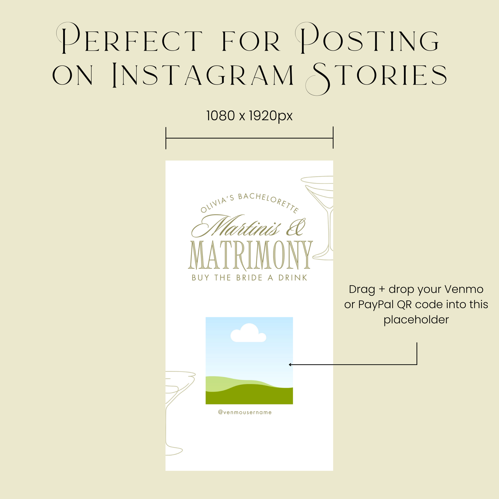 Add a special touch to your bachelorette party with this customizable Buy the Bride a Drink template for Instagram stories! Edit & customize the design within Canva to create an eye-catching Venmo/Cash App/PayPal QR code graphic in minutes.