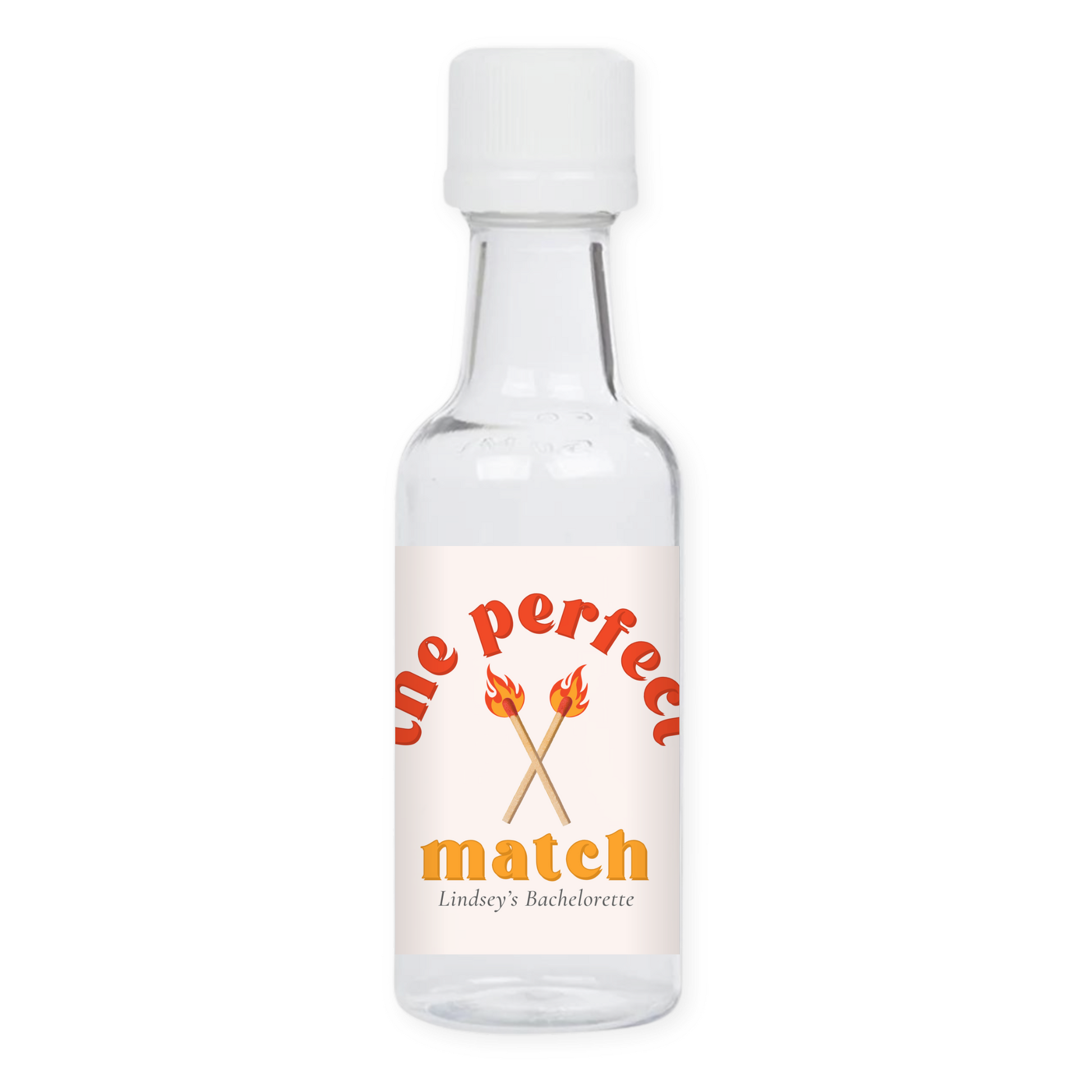Spark some fiery fun with our 'Perfect Match' mini liquor label, tailored for red and orange-themed bachelorette celebrations. She found her perfect match — now ignite an unforgettable celebration with this shooter label that serves as an adorable inclusion for bachelorette gift bags, adding a personalized touch.