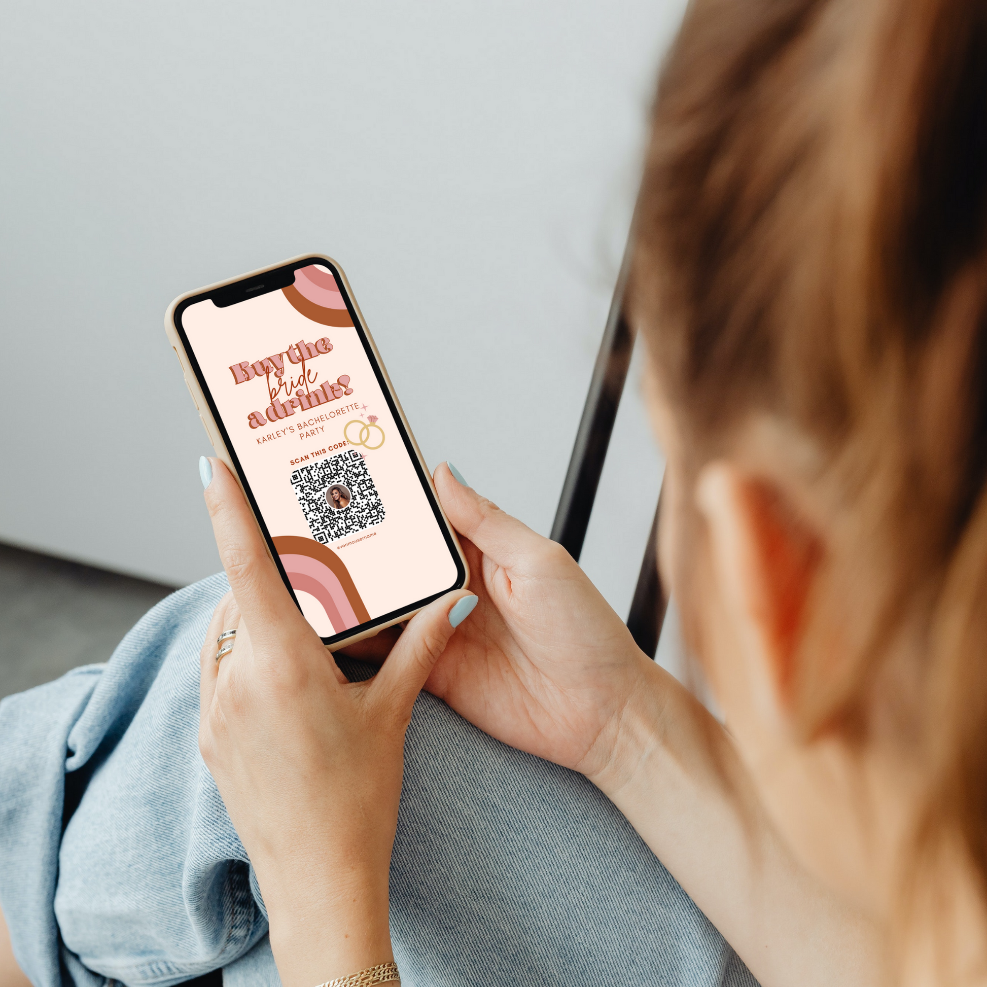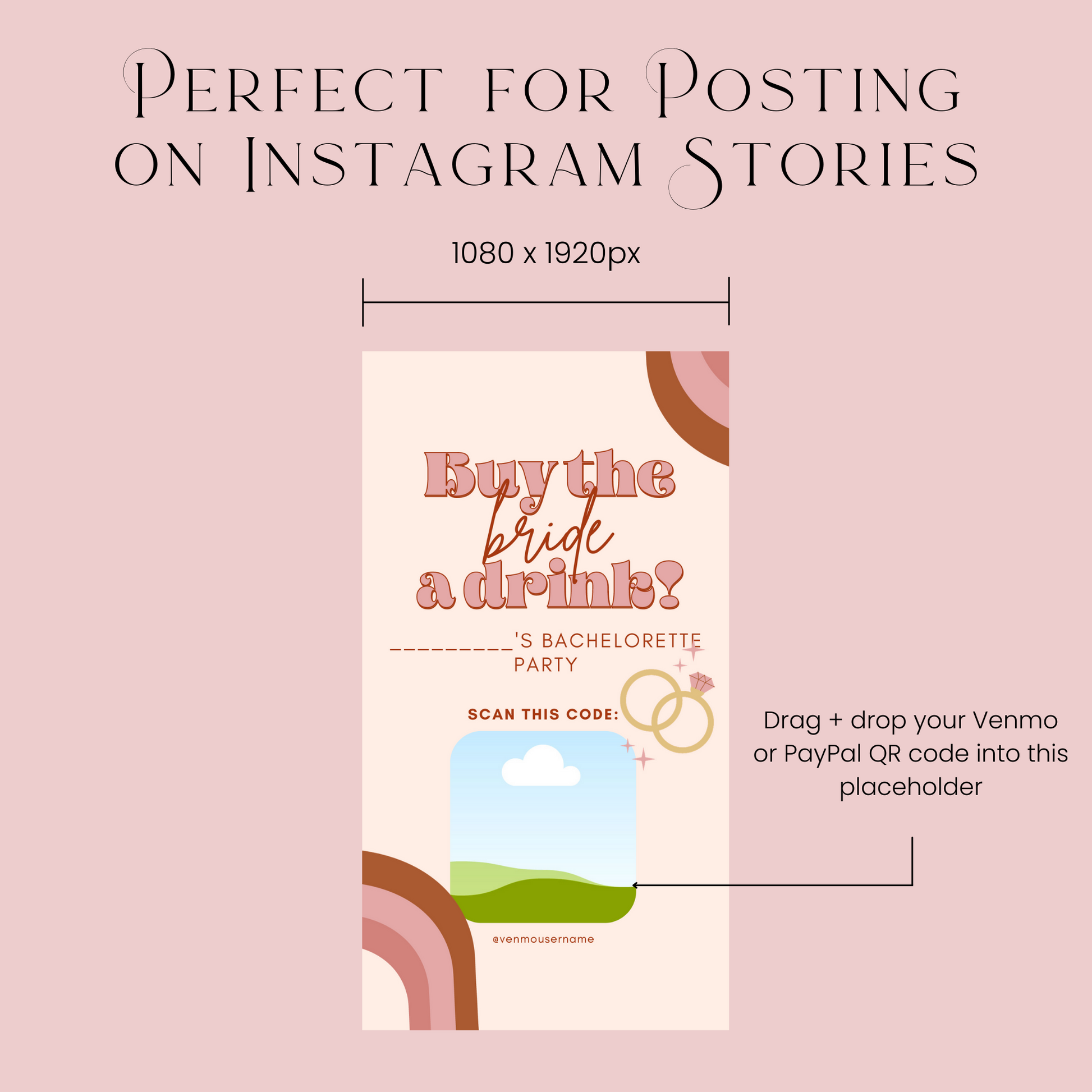 Add a special touch to your bachelorette party with this customizable Buy the Bride a Drink template for Instagram stories! Edit & customize the design within Canva to create an eye-catching Venmo/Cash App/PayPal QR code graphic in minutes.