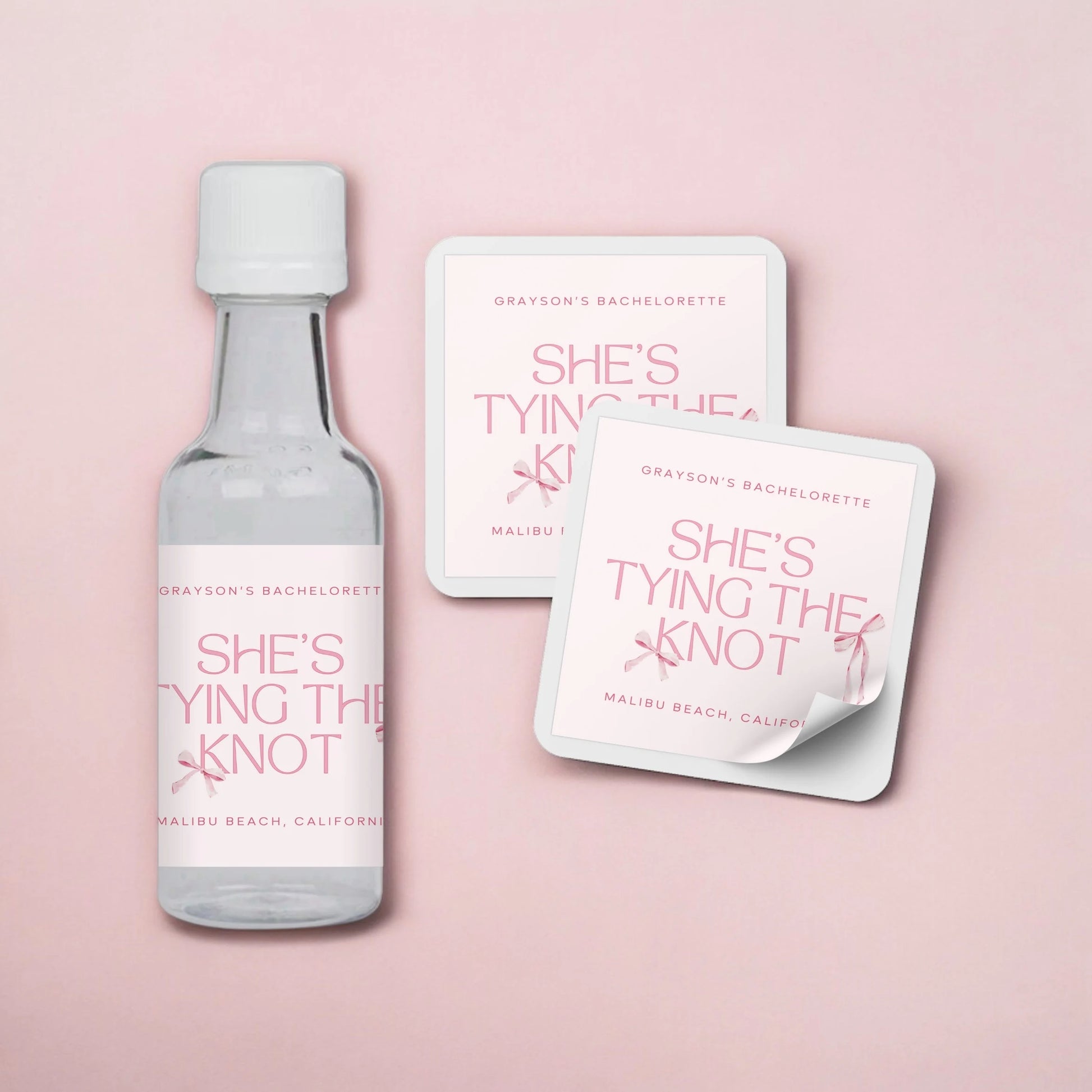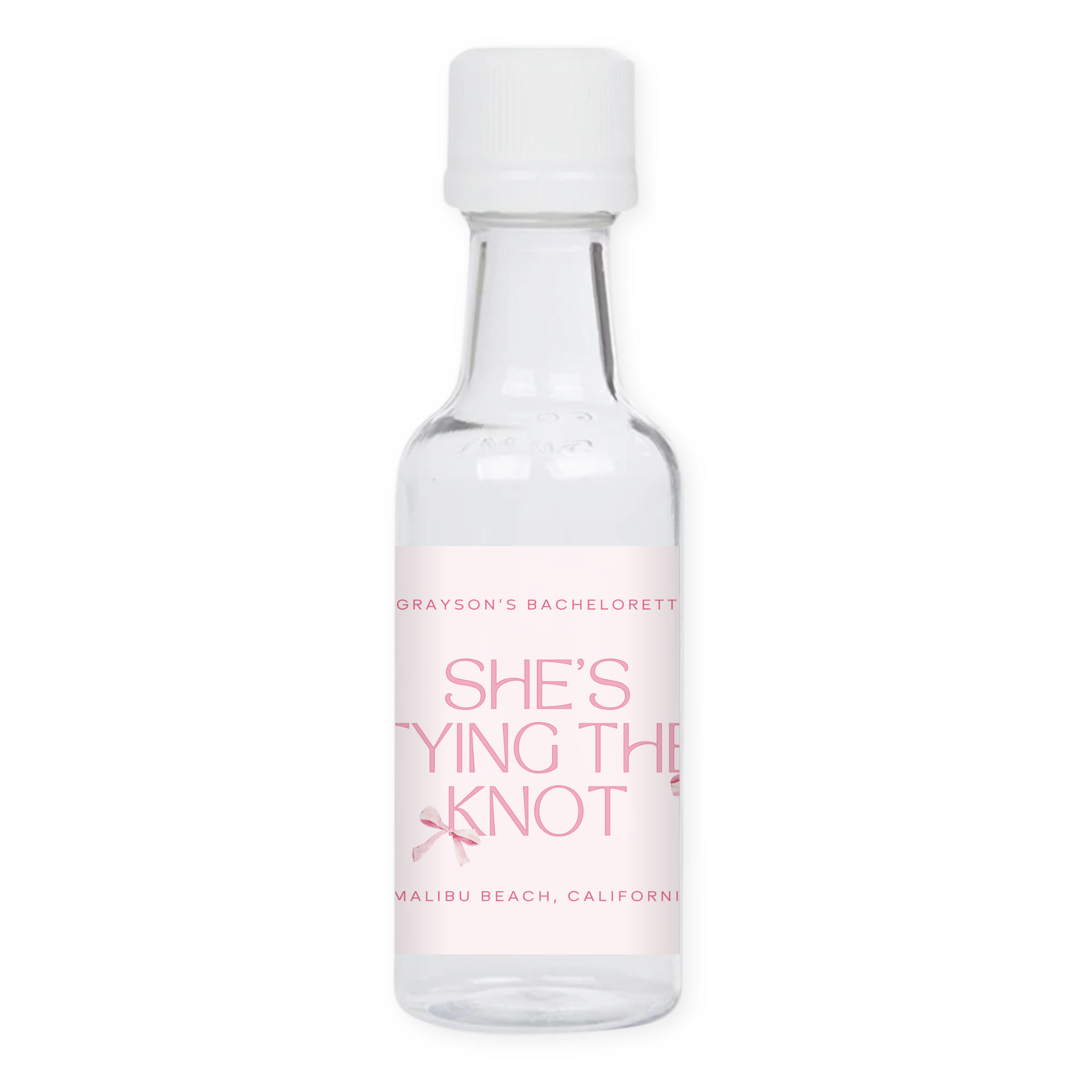 Add a touch of elegance to your pink bow-themed coquette bachelorette party with our 'She's Tying the Knot' shooter label! This feminine, stylish label transforms mini liquor bottles into memorable party favors. Whether you’re toasting with champagne or cocktails, this sticker label ensures every drink is dressed to impress. Cheers to unforgettable memories with your bridesmaids!